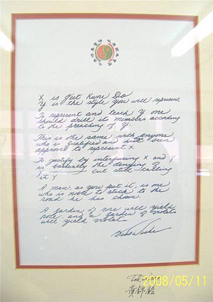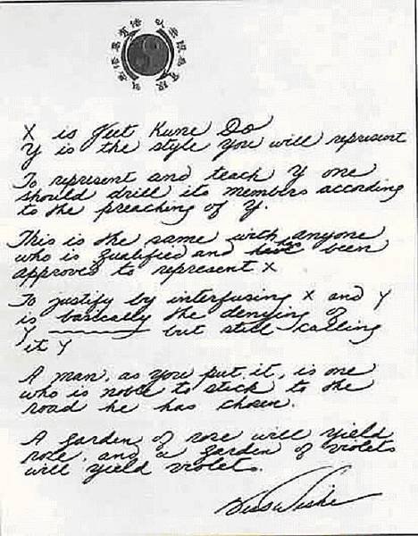 “X是截拳道,Y是你要傳授的另一種武技。為 了代表與傳授Y,就必須按照Y道理反復的教學生練習。對於任何有資格及授權可傳授X的人來說也應持相同的態度。將X與Y進行混合基本上就是摒棄Y——但仍然將這種武技稱之為Y。一位人格高尚的人,應忠於 他所選擇的道路。玫瑰花園只會生長玫瑰,紫羅蘭花園也只會長出紫羅蘭。”